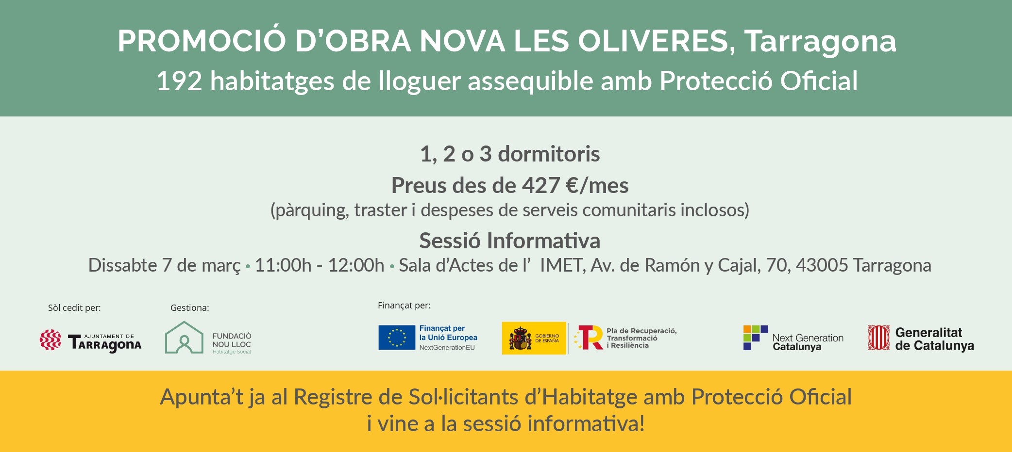 El dissabte 7 de març, a les 11h, es durà a terme una sessió informativa per tal d’explicar a la ciutadania tota la informació en relació a la nova promoció de 192 habitatges amb protecció oficial en règim de lloguer assequible, situada a la plaça de la Primera Parellada, entre Bonavista i Campclar, a Tarragona.